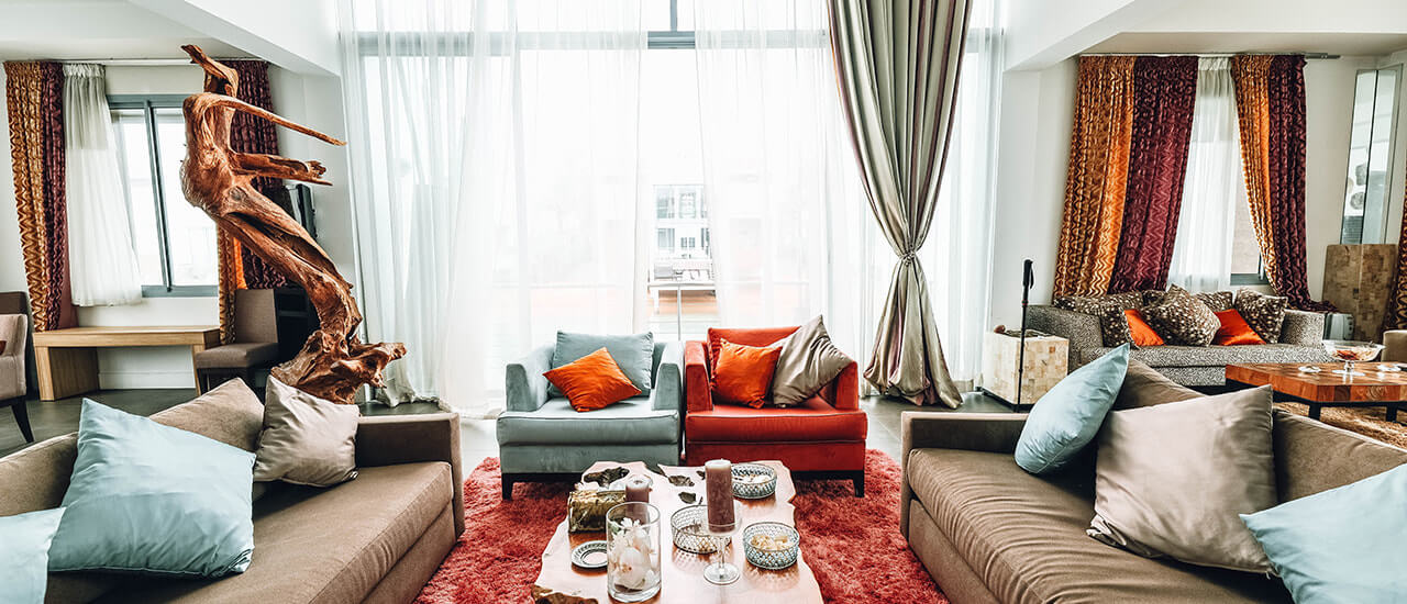 Drapes are the perfect medium for connecting space with the outside world. Thicker drapes offer sound insulation and noise prevention. Drapes can also block pollen, dust, particles, odors, and more from entering the room through open windows.